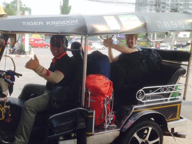 Von Chiang Mai mit dem VIP Bus nach Chiang Rai. Nach ca. 5h Fahrt sind wir gegen Abend in der Stadt angekommen. Für nur 18€/ Nacht sind wir in einem unglaublich schönen und gepflegtem Guesthouse untergekommen. Stadtrundgang im Mondenschein. Am nächsten Morgen mit unserem eigenen Tuktuk-Fahrer zum Busbahnhof schnell die Tickets für die Weiterreise gekauft und Gepäck eingelagert und noch zum beeindruckenden weißen Tempel gefahren, bevor es gegen 10:30 Uhr weiter Richtung Laos ging.